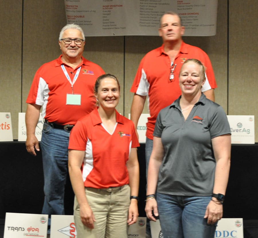 At $7,300, the third high selling lot was rights to an IVF session with Kash-In Thrasher 76560 {5}, consigned by Kash-In Jerseys, represented by Cornell Kasbergen, center. The lot was purchased by Victory Jerseys, represented by Brad Barham, right. Also pictured are Queen Townsend, Smith and Hill.
